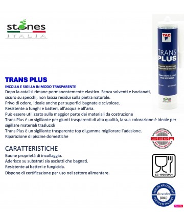 Der Dichtstoff Trans PLUS 310 ml hat eine gute Klebkraft und ist ideal für die Anwendung auf Naturstein (färbt nicht). TRANS PLUS haftet auch gut auf Fliesen, Keramik, Porzellan, Aluminium, Holz, Beton, verzinkten Oberflächen usw. und benötigt keinen Primer. TRANS PLUS ist schimmel- und bakterienbeständig, verträgt sich mit den meisten Farben, ist geruchlos und kann auch auf feuchten Oberflächen verwendet werden. TRANS PLUS ist ideal zum Abdichten von Naturstein und anderen porösen und nicht porösen Oberflächen, wo das Risiko von Flecken unbedingt vermieden werden muss. Effektiv beim Abdichten und Kleben von Fliesen, Naturstein, Holz, Beton, Aluminium, kann TRANS PLUS auf allen Baustellenmaterialien angewendet werden, wo eine transparente Verbindung erforderlich ist (außer PP, PE, PTFE und Teer). TRANS PLUS ist hervorragend für gängige Anwendungen, ideal zum Kleben und Dichten von Badzubehör, Holzböden, Überdachungen, Türen und Fenstern.