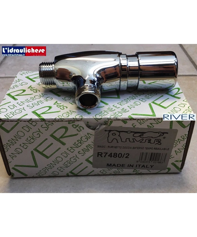MAGIC – externer Mischbatterie für Dusche 3/4" M x 3/4" M Wandmontage mit Dübel Ø 8 – Rosette Ø 50 – einstellbare Öffnungszeit mit dem beiliegenden Schlüssel von 0 bis 50 Sekunden, mit automatischem Durchflussgerät für eine konstante Abgabe von 9 Litern/Minute bei 0,5 bis 9 bar – Messingkartusche mit Nadel und Edelstahlfiltern und mit blauen und roten Markierungen für den Griff