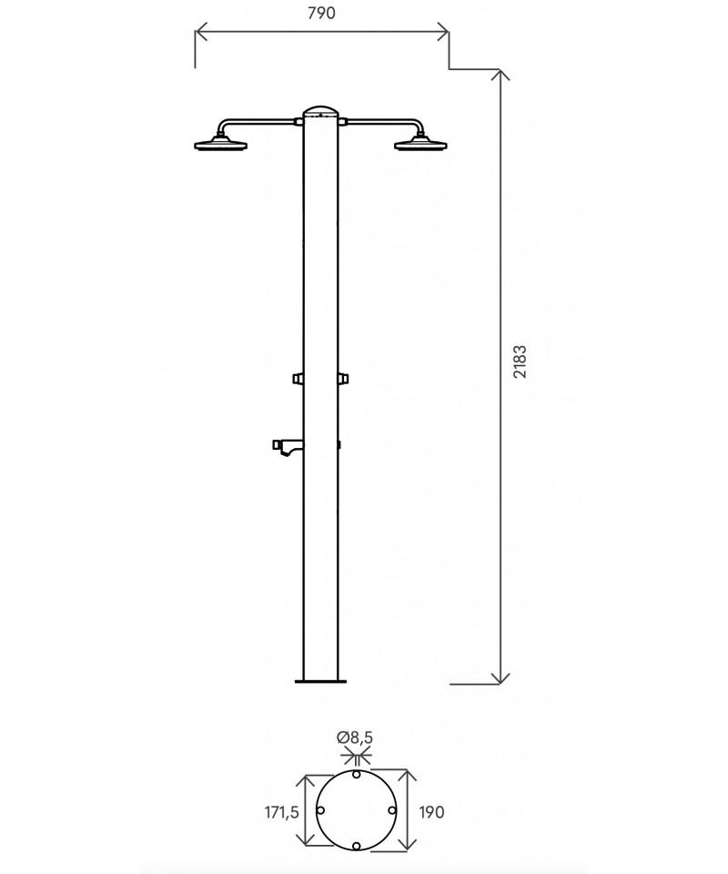 Obwohl es über eine Kapazität von 70 Litern verfügt, behält es kompakte und minimalistische Formen bei, die sich an jede Umgebung anpassen und gleichzeitig eine deutlich über dem Marktdurchschnitt liegende Autonomie gewährleisten, perfekt also für Landhöfe, Campingplätze, Strandbetriebe, Schwimmbäder und alle Gemeinschaftsbereiche. Wie Tevere besteht es aus einem solarbetriebenen Edelstahlrohr mit mattschwarzer Lackierung. Die hydraulischen Komponenten bestehen aus edelmetallischen Materialien, die für den Außenbereich entwickelt und behandelt wurden. Die Regenbrause verfügt über weiche, gummierte Düsen, die die Entfernung von Kalkstaub sehr einfach und schnell machen und die Lebensdauer des Bauteils erheblich verlängern. Der energiesparende "eco rain"-Duschkopf mischt dank spezieller Lücken im Duschgitter Luft mit Wasser und sorgt für einen kraftvollen und effektiven Strahl, während weniger Wasser verbraucht wird. An einem sonnigen Tag wird Arno in der Lage sein, reichliche und große Mengen an Duschen zu jeder Tageszeit zu gewährleisten.
