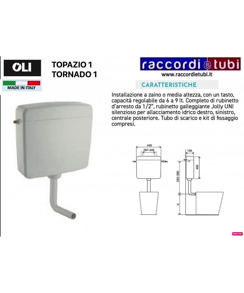 Installation als Rucksack oder in mittlerer Höhe, mit einem Knopf, einstellbare Kapazität von 6 bis 9 l. Komplett mit Absperrhahn 1/2", leiser Schwimmerventil Jolly UNI für Wasseranschluss rechts, links, zentral hinten. Abflussrohr und Montageset enthalten.