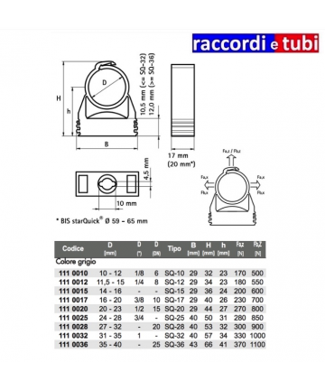 Technische Daten - Um die StarQuick®-Bügel an unseren CorRail- oder STRUT-Profilen zu befestigen - Um Rohre schnell und einfach zu einer bereits bestehenden Installation hinzuzufügen - Geeignet für StarQuick® von SQ-10 bis SQ-51 - Material: modifiziertes PA6, grau (nach UNI 7035) - UV-beständig, altersbeständig, beständig gegen Öle und Erdölprodukte - Korrosionsfrei, recycelbar - Temperaturen: von -40°C bis 90°C - für begrenzte Zeiträume, geeignet bis 130°C.