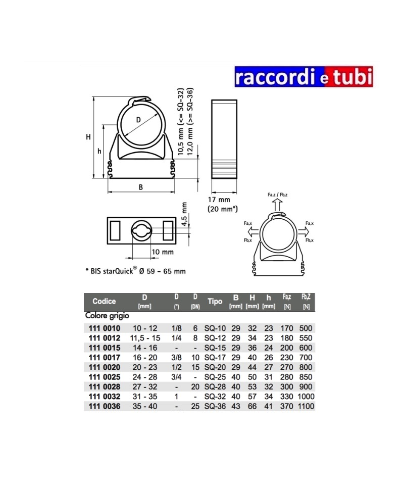 Technische Merkmale und Vorteile - Automatische und patentierte Verschluss - Werkzeugloser Verschluss durch Druckausübung auf das Rohr - Ideal für alle Anwendungen, einschließlich korrosiven Umgebungen, Witterungseinflüssen, Chemiefabriken, Schwimmbädern usw. - Hohe chemische Beständigkeit - Vollständige Befestigung um das Rohr - UV-beständig gegen Alterung, Öle und Derivate von Petroleum - Hergestellt aus modifiziertem Polyamid (PA 6), halogenfrei - Geeignet von -40° bis 90° C - Jede StarQuick® deckt mehrere Durchmesser ab - Vollständige Range von Durchmesser 9,5 bis Durchmesser 65,0 - Entflammbarkeitsmerkmale gemäß UL 94-V2 - Farbe grau (RAL 7035) oder kupfer. Andere Farben auf Anfrage verfügbar - CE- und KIWA-Zertifizierungen (NL) 01 Fa,z [