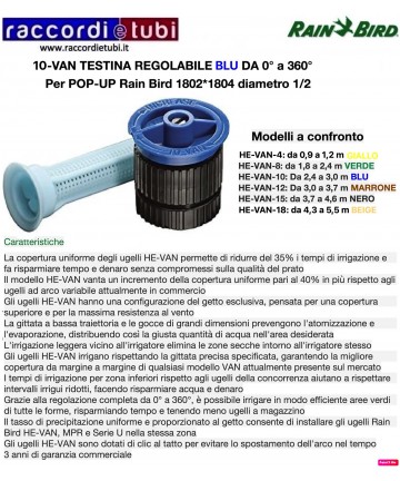 Die VAN-Düsen bieten eine gleichmäßige Abdeckung über das gesamte Beregnungssystem, für ein immer gesundes und schönes grünes Areal. Die sanfte Beregnung in der Nähe des Sprinklers verhindert trockene Zonen um den Sprinkler selbst. Die VAN-Düsen erzeugen große, windbeständige Tropfen, die die Zerstäubung und Verdunstung verhindern und somit die richtige Menge Wasser im gewünschten Bereich verteilen.
