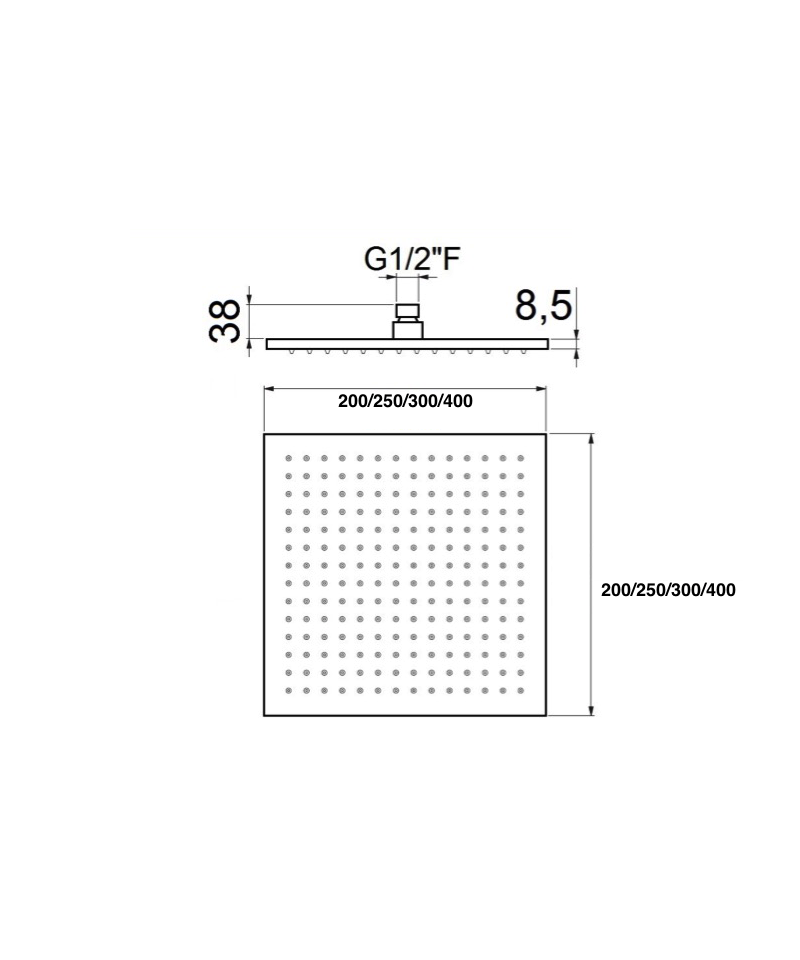Erhältlich in den Größen 200 x 200, 250 x 250, 300 x 300 und 400 x 400 mm; sie können mit einer Vielzahl von Duscharmen kombiniert werden.