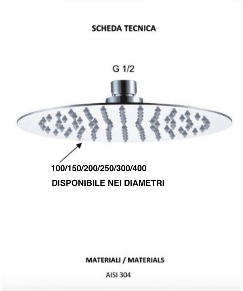 Verfügbar in den Größen 200 x 200, 250 x 250, 300 x 300 und 400 x 400 mm; sie sind mit einer breiten Palette von Duscharmen kombinierbar.