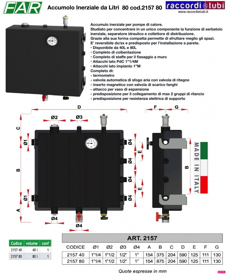 Hydraulischer Separator/Entlüfter/Schlickfänger MUT ECO-Serie. Ausführung INOX 304 FX" mit gewindedurchmessenden Anschlüssen: • 1" M (FX 7.030.03296) • 1"¼ M (Art.-Nr. FX 7.030.03297) • 1"½ M (FX 7.030.03298) • 2" M (FX 7.030.03297) aus Stahl AISI 304L. Verwendbare Flüssigkeiten sind Wasser und glycolhaltige Lösungen. Maximaler Glykolanteil 50%. Maximaler Betriebsdruck 10 bar. Betriebstemperaturbereich 0÷110 °C. LIEFERUMFANG: • Automatisches Entlüftungsventil mit Messingschale UNI EN 12165 CW 617 N • Hydraulische Dichtungen in EPDM/VITON • Kugelhahn mit Messingschale UNI EN 12165 CW 617 N • Front-Sondenanschluss 1/2" F Schaum-Polyethylen-Isolierung mit einer Dicke von 12 mm