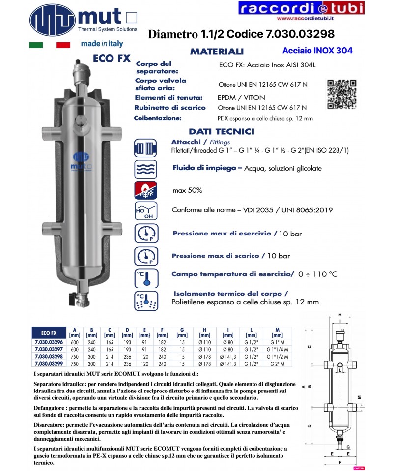 Inertialspeicher Space Mut aus Edelstahl INOX 304, isoliert für hybride Systeme und Wärmepumpen, mit 4 oder 6 Hauptanschlüssen 1"¼ weiblich. • Abflusskugelventil G¾" Messing CW617N (EN 12165) • Automatisches Entlüftungsventil G¾" Messing CW617N (EN 12165) • Inertialspeichergehäuse: stahlentrostet lackiert • Verwendbare Flüssigkeiten: Wasser und glykolhaltige Lösungen gemäß UNI8065:2019 / VDI2035 (% max Glykol=50%). • Maximale Betriebsdruck: 6 bar. • Betriebstemperaturbereich 0÷100°C. • Isolierung: vorgeformte Hülle aus geschäumtem PE-X mit geschlossenem Zellendicke von 15 mm. Betriebstemperaturbereich -40÷130 °C.