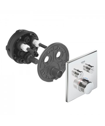 Der eingebauter thermostatischer Mischbatterie Grohtherm SmartControl bietet eine ergonomische Bedienung auf Knopfdruck und ein elegantes Design im Herzen Ihres Badezimmers. Mit der innovativen SmartControl-Technologie können Sie den gewünschten Wasserfluss auswählen und die Menge an Wasser durch Drücken und Drehen der Tasten steuern. Dank der beiden Ventile können Sie einfach zwischen Kopfbrause und Handbrause oder zwischen Dusche und Badewanne wechseln oder beide kombinieren. Die integrierte GROHE TurboStat-Technologie verhindert unerwünschte Temperaturschwankungen. Die Zeichen GROHE EasyLogic und die Struktur der Tasten mit wechselbaren Symbolen machen die Benutzung einfach und intuitiv. GROHE SafeStop ermöglicht die Einstellung einer maximalen Temperatur von 38 °C. Die GROHE EcoJoy-Technologie zur Wassereinsparung bietet die Möglichkeit, den Durchfluss zu reduzieren, ohne das Duscherlebnis zu beeinträchtigen. Dank des GROHE QuickFix-Systems ist die Montage blitzschnell. Die chromierte GROHE StarLight-Oberfläche ist langlebig und sieht auch nach Jahren wie neu aus. Das elegante und kantige Design vervollständigt das Badezimmerdesign. Dieser thermostatische Mischbatterie muss zusammen mit dem Einbauteil GROHE Rapido SmartBox (35600000) installiert werden.