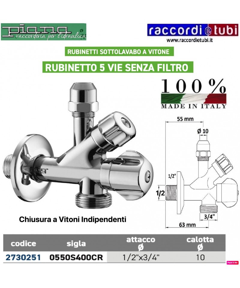 MESSINGVERCHROMESES UNTERBAU-VENTIL 5-WEGE 1/2''x3/4''x10mm MIT UNABHÄNGIGEN ABSCHLÜSSEN