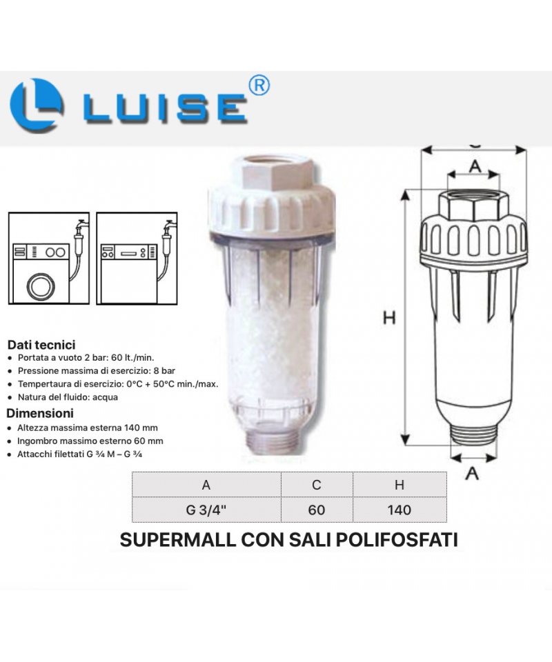 SUPERSMALL ist ein Filter mit Polyphosphaten, der speziell dafür entwickelt wurde, direkt an den Wasserzulauf der Waschmaschine, Geschirrspülmaschine oder anderer ähnlicher Geräte angebracht zu werden, um die schädliche Ablagerung von Kalk zu vermeiden.