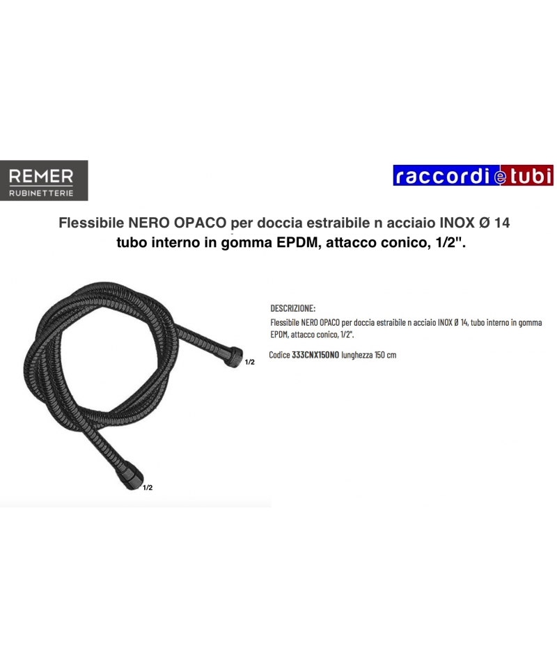 Schwarzer, matter FLEXIBLE Schlauch für herausziehbare Dusche aus Edelstahl Ø 14, Innenrohr aus EPDM-Gummi, konische Verbindung, 1/2''.