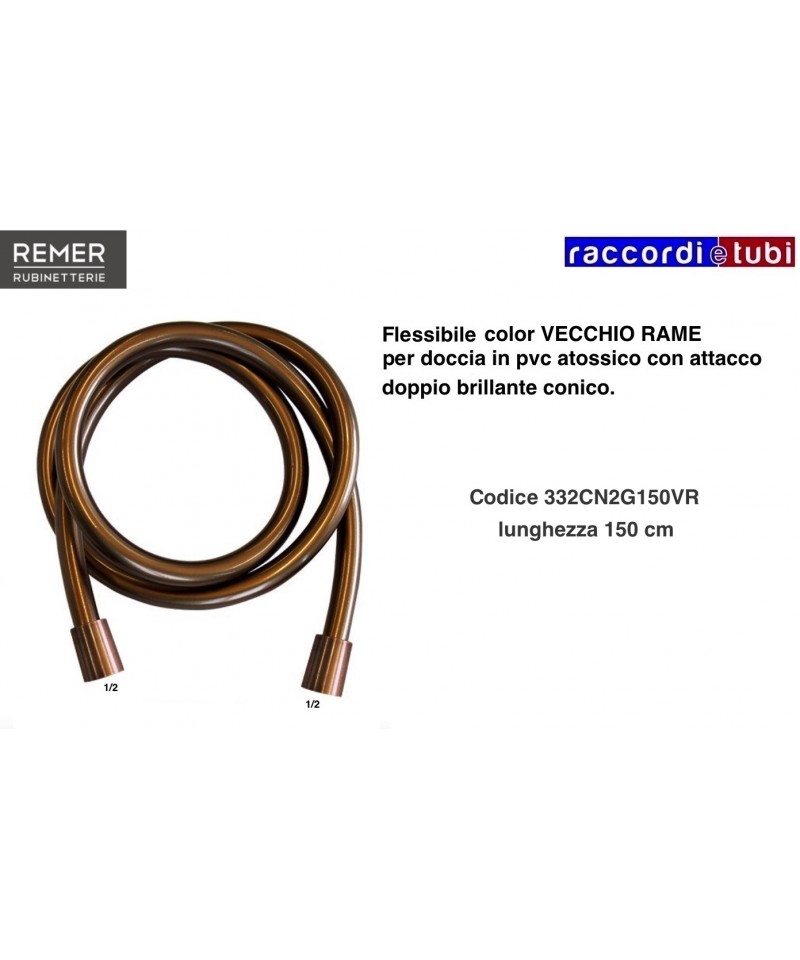 Flexibler, altkupferfarbener Duschschlauch aus unbedenklichem PVC mit doppeltem glänzendem konischen Anschluss.