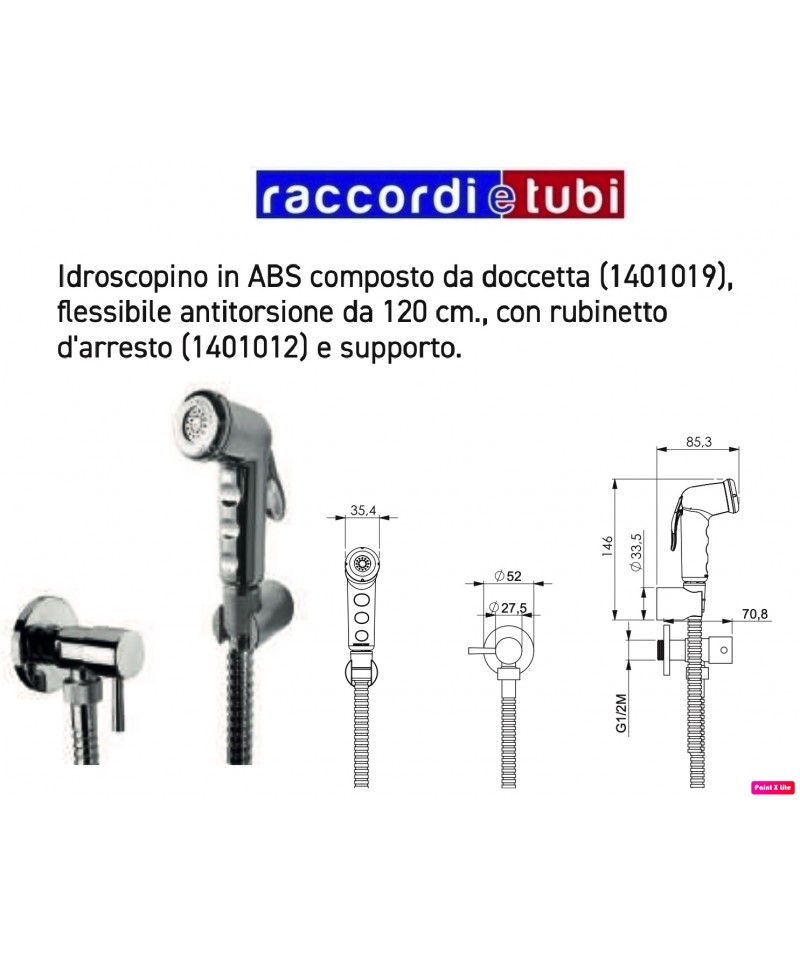 Waschrohr aus ABS, bestehend aus einer Dusche (1401019), einem drehbaren Schlauch von 120 cm, mit Absperrhahn (1401012) und Halterung.