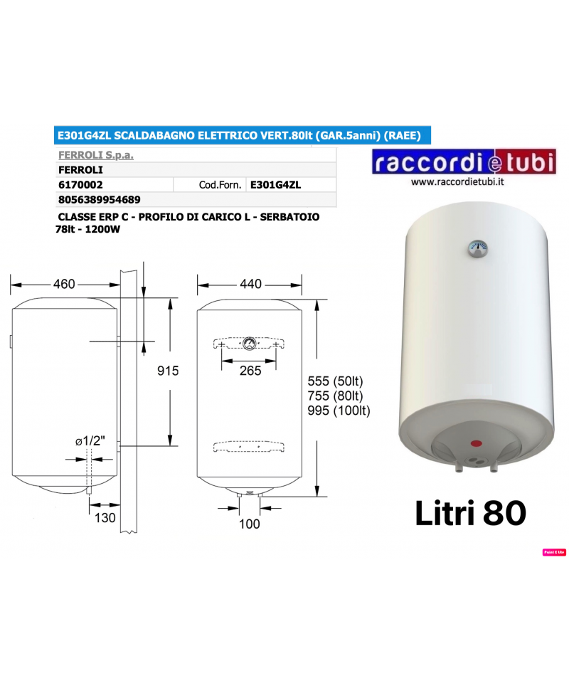 ELECTRICHE WASSERHEIZER RADI LT.80 VERTIKAL 5 JAHRE