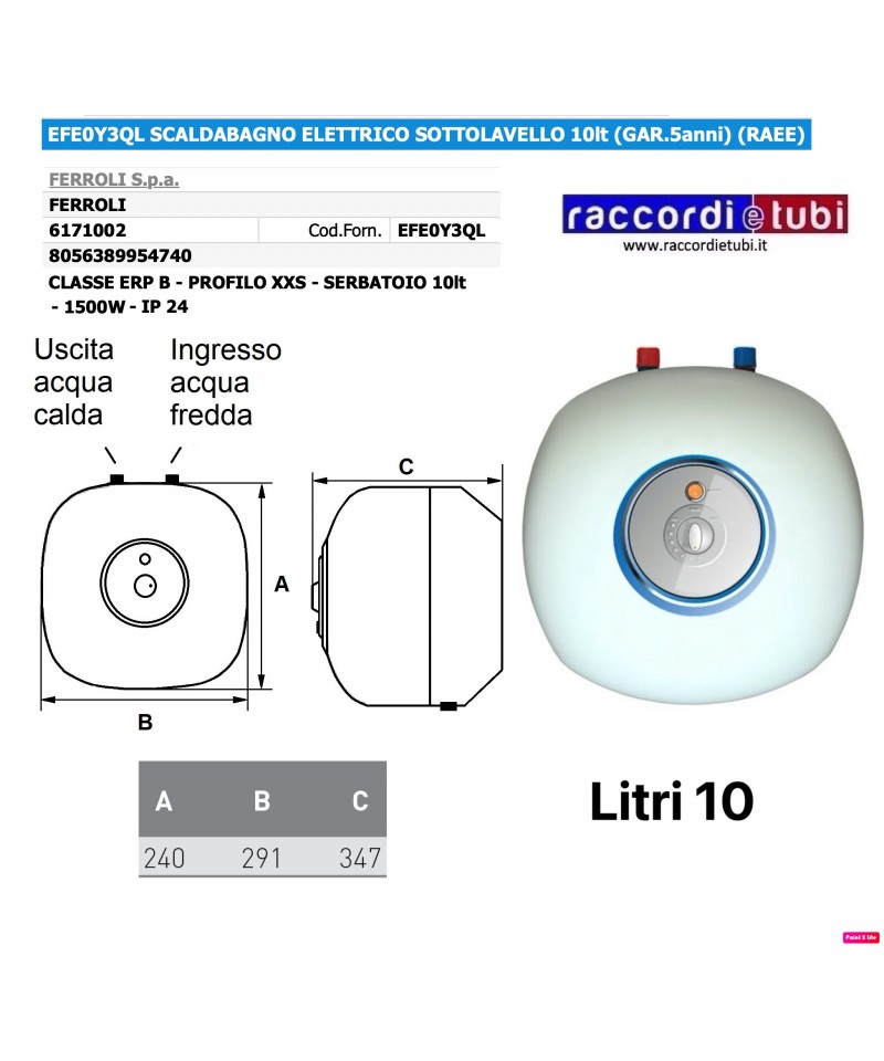 Glasporzellan-Boiler mit hygienischer Behandlung. Elektrische Heizung aus rostfreiem Stahl. Magnesiumanode. Externer Temperaturschalter mit LED-Leistungsanzeige. Außengehäuse aus ABS. Kapillarthermostat zur Temperaturkontrolle.