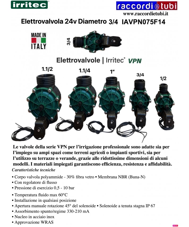 IRRITEC Elektroventil für die Bewässerung der Serie VPN PROVALVE, Weibchen-Weibchen DN 3/4 bei 24 VAC mit Durchflussregler. Die Ventile der 3. Serie für die Bewässerung sind effizient, robust und vielseitig. Sie wurden mit einem Durchflussregler entworfen. Geeignet sowohl für den Einsatz auf großen Flächen wie landwirtschaftlichen Flächen oder Sportanlagen, als auch auf kleinen Terrassen. Klassifizierung: einfache Bauart, Geometrie 180°. Betriebseigenschaften: Betriebsdruck von 0,5 bis 10 bar, Umgebungstemperatur von 0 bis 60 °C, Fluidtemperatur 60 °C, Arbeitszyklus ED 100%, unidirektionale Durchflussrichtung.