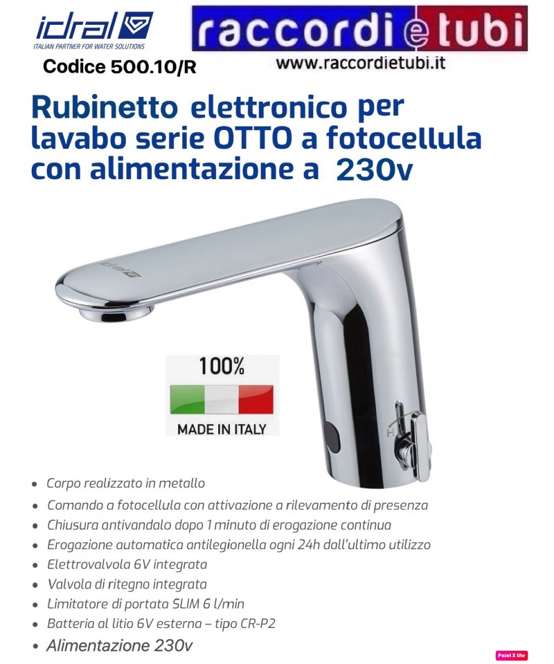 Armatur mit Fotuszelle aus poliertem und verchromtem Messing mit drehbarem Körper und automatischem Durchflussregler von 9 l/min. - patentiert - die Fotuszelle dreht sich mit der Auslassöffnung und ermöglicht das Befüllen auch von Waschbecken mit doppeltem Becken - für den professionellen Einsatz mit einem kontinuierlichen Auslassring für maximal 5 Minuten - Stromversorgung mit normaler 9V Alkalibatterie für ca. 100.000 Anwendungen (2 Jahre) - oberer Deckel für einfachen Austausch der Batterie ohne Polaritätskontrolle - inklusive flexiblem Edelstahlrohr 350 mm. Dynamischer Druck 0,5-6 bar