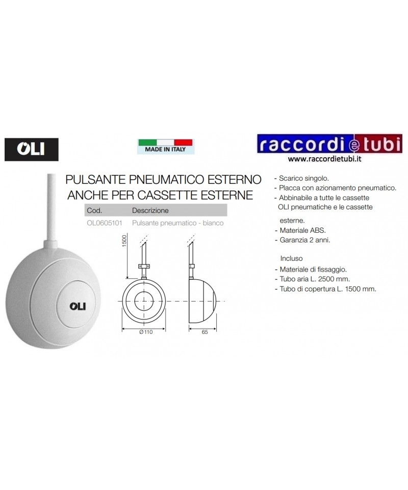 Einzelentladung. - Platte mit pneumatischem Betätigung. - Kombinierbar mit allen pneumatischen OLI-Spülkästen und externen Spülkästen. - Material ABS. - Garantie 2 Jahre. Inklusive - Befestigungsmaterial. - Luftschlauch L. 2500 mm. - Abdeckschlauch L. 1500 mm