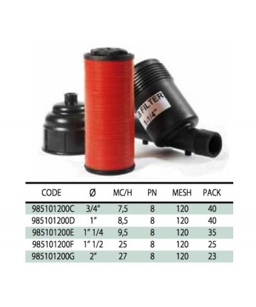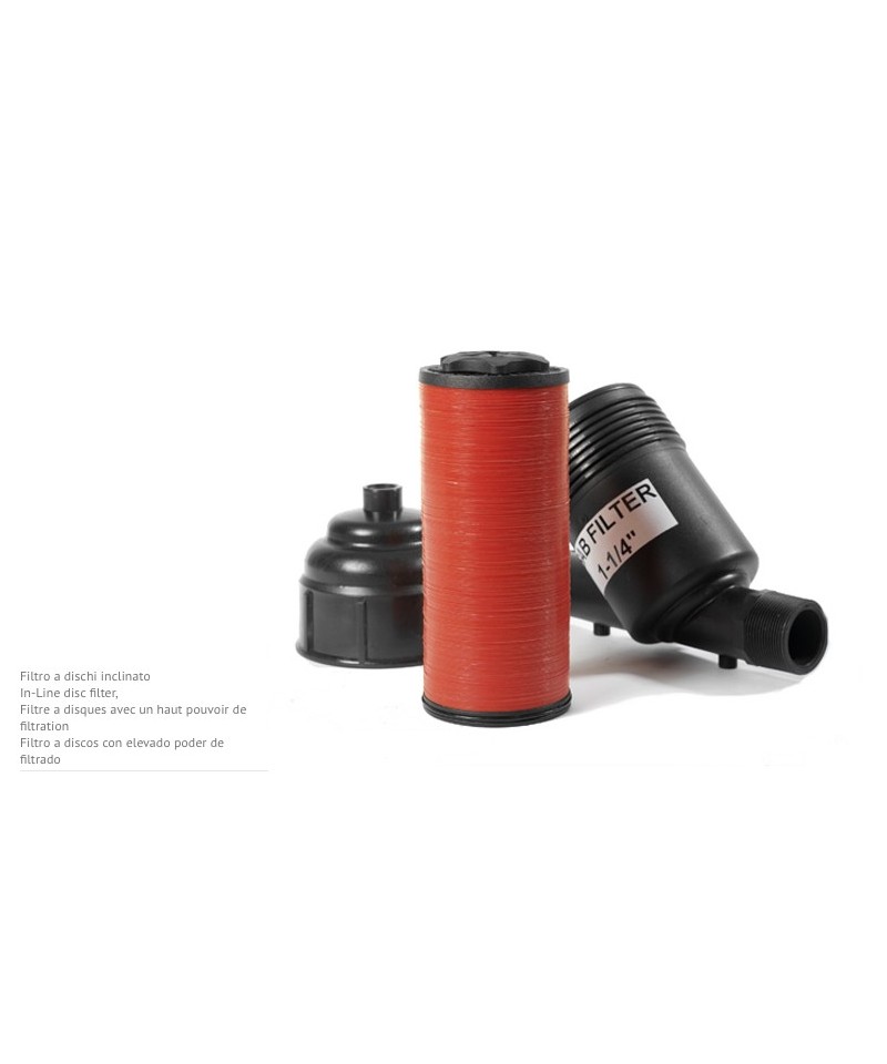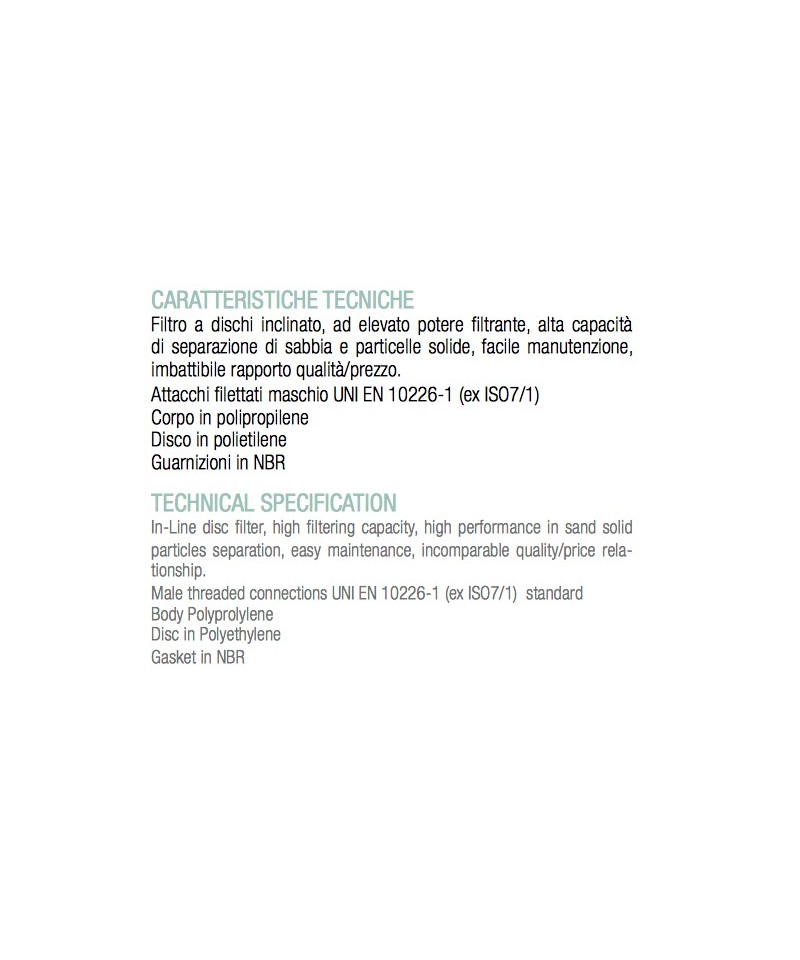 Patentierte selbstreinigende Zyklon-Entschlammungsfilter. Dank des Super-Schraubeneffekts reduziert sich die Anzahl der Reinigungen erheblich: Dies wird durch die patentierte Schraube erreicht, die an der Basis der Kartusche angebracht ist und einen spiralförmigen Effekt erzeugt, der die Schwebeteilchen vom Filterelement entfernt. Ausgestattet mit einem A Clamp-Verschlussring aus Edelstahl (AISI 316) und einer großvolumigen Kartusche aus Edelstahl, Filterkörper aus verstärktem Polyamid und Ablassventil.
