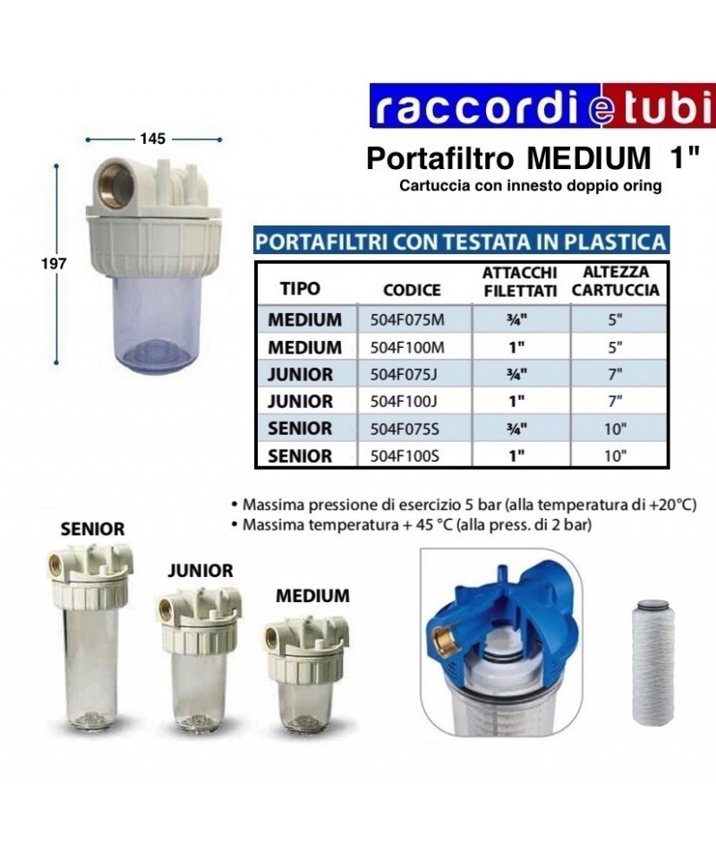 Die IN/OUT-Anschlüsse sind in Messing mit 3/4" und 1" BSP-Gewinde erhältlich. Die Höhe der mit den Modellen kompatiblen Patronen variiert von 5" bis 20".