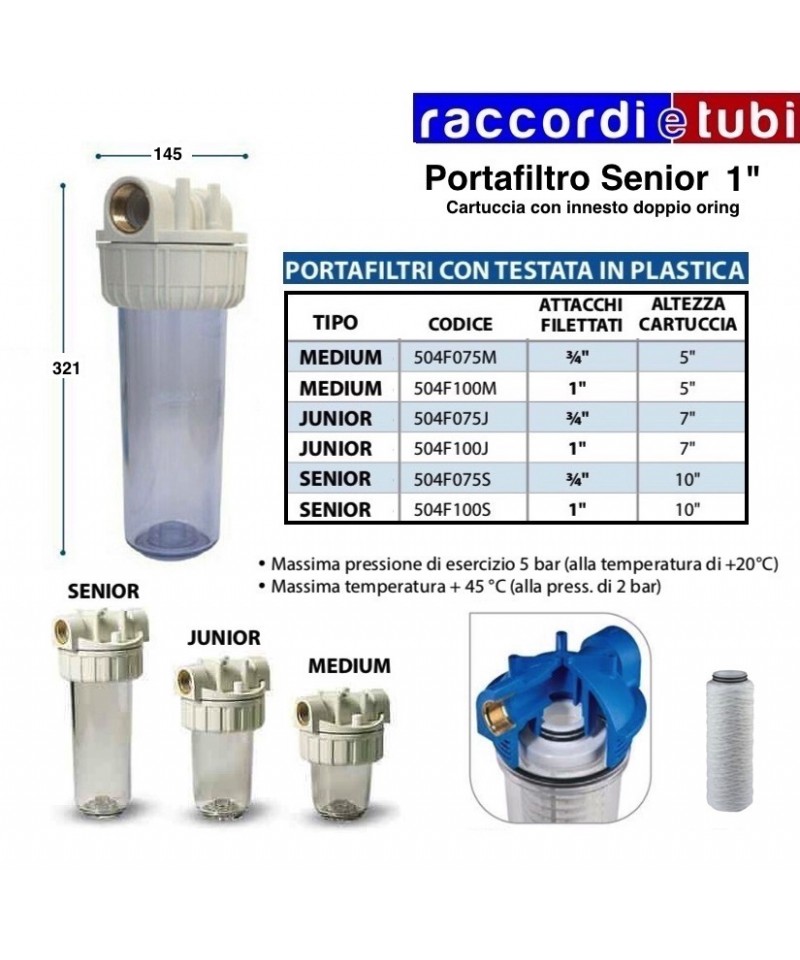 Die IN/OUT-Anschlüsse sind aus Messing in 3/4" und 1" mit BSP-Gewinde erhältlich. Die Höhe der anpassbaren Kartuschen reicht von 5" bis 20".