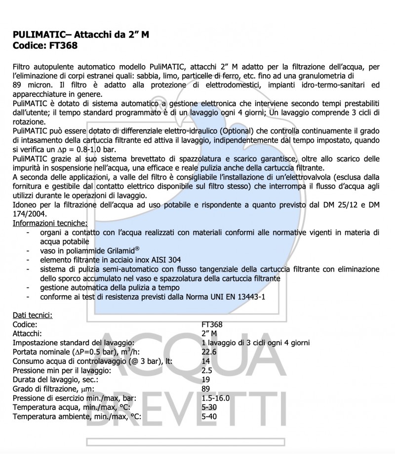 Sand ohne Demontage. Die Ausführungen 1"1/2" und 2" sind mit einem Manometer zur Druckkontrolle ausgestattet. EINGESCHLOSSEN "BIOS" SYSTEM, bakterielle Inhibierung.
