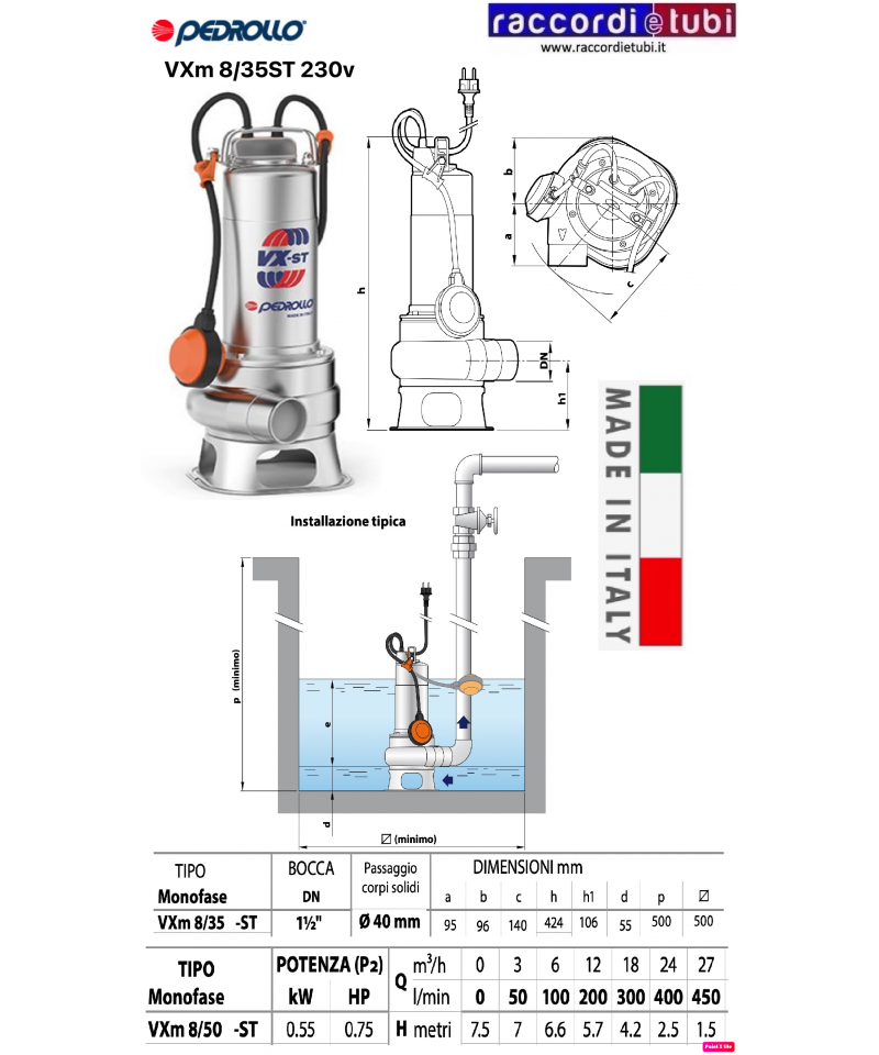ELEKTROPUMPE PEDROLLO TAUCHPUMPE FÜR SCHMUTZWASSER "VORTEX" MONOFASIG VXM10/35