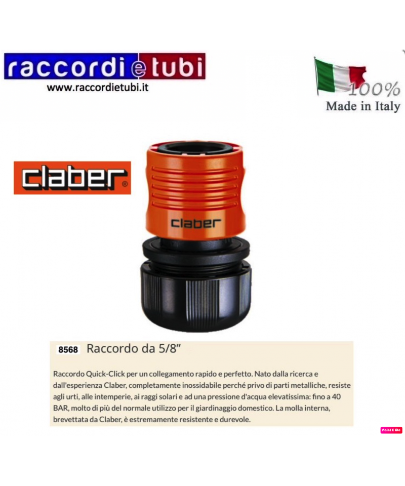 Schnellanschluss Quick-Click für eine schnelle und perfekte Verbindung. Entstanden aus der Forschung und Erfahrung von Claber, vollständig rostfrei, da ohne Metallteile, widerstandsfähig gegen Stöße, Witterung, Sonnenstrahlen und einem extrem hohen Wasserdruck: bis zu 40 BAR, weit mehr als die normale Verwendung für die Gartenbewässerung. Die von Claber patentierte Innenfeder ist äußerst strapazierfähig und langlebig.