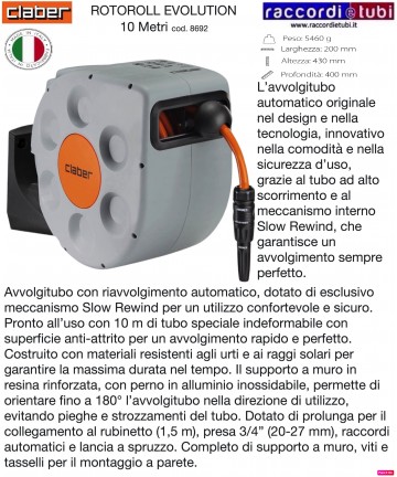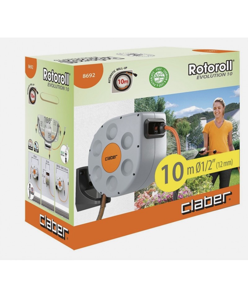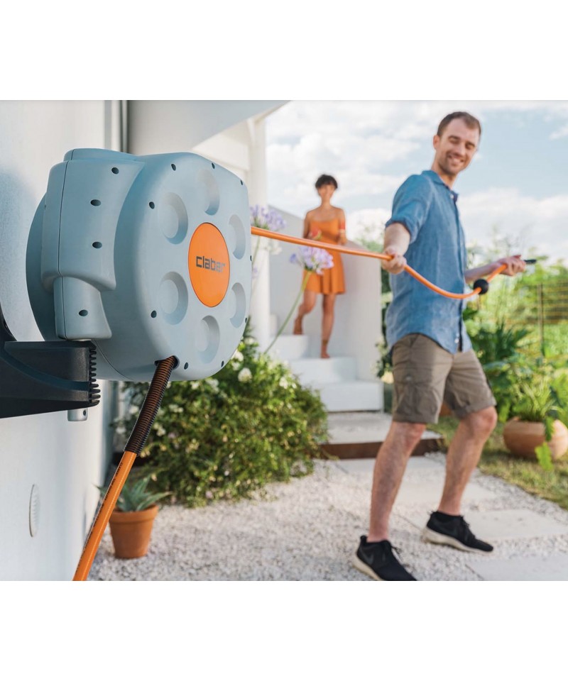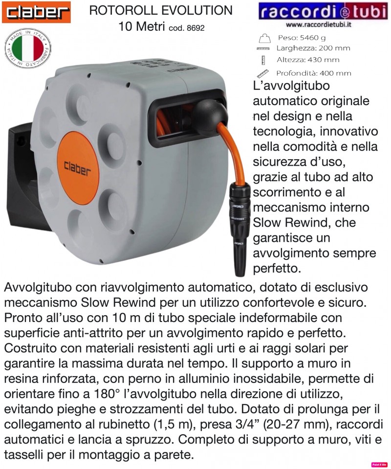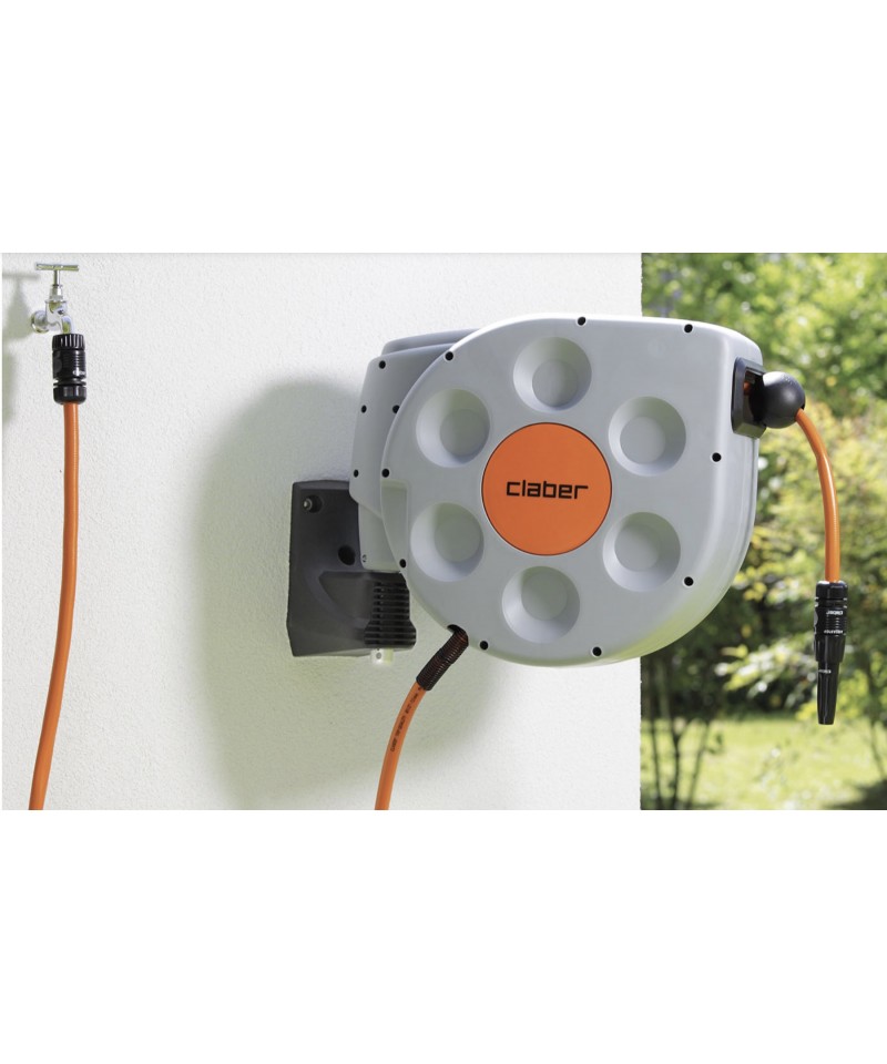 Automatischer Schlauchaufroller mit exklusivem Slow Rewind Mechanismus für einen komfortablen und sicheren Gebrauch. Betriebsbereit mit einem speziellen, verformungsfreien 10 m Schlauch mit reibungsfreier Oberfläche für ein schnelles und perfektes Aufrollen. Hergestellt aus stoßfesten Materialien und UV-beständig für maximale Langlebigkeit. Die Wandhalterung aus verstärktem Kunststoff mit rostfreiem Aluminiumdorn ermöglicht es, den Schlauchaufroller um bis zu 180° in die Arbeitsrichtung zu drehen, um Knicke und Quetschungen des Schlauches zu vermeiden. Ausgestattet mit einem Verlängerungsschlauch für den Wasserhahn (1,5 m), einem 3/4” Anschluss (20-27 mm), automatischen Anschlüssen und einer Spritzdüse. Complete mit Wandhalterung, Schrauben und Dübel für die Wandmontage.