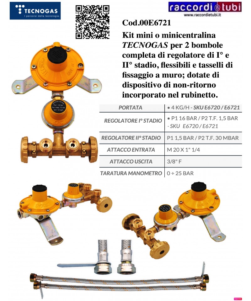 Kit Minizentralsteuerung TECNOGAS zum Anschluss von 2 GPL-Zylindern, komplett mit zwei Reglern, einem für hohen und einem für niedrigen Druck, 2 Anschlussflexschläuchen, Dübel zur Wandbefestigung und einem Rückschlagventil im Hahn integriert.