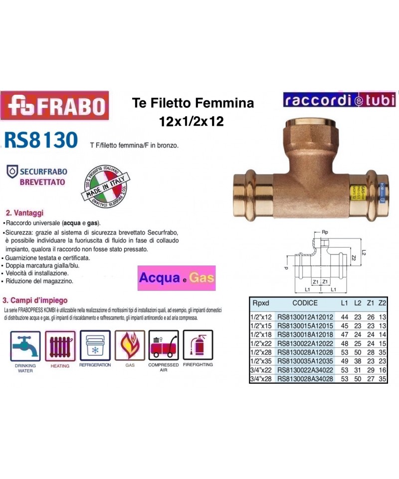 FRABOPRESS KOMBI, mit dem System Securfrabo, ist eine Produktreihe bestehend aus Pressfittings aus Kupfer und Bronze, die in den Dimensionen von 12 bis 54 mm erhältlich ist, anwendbar sowohl für leitende Systeme für Gas als auch für Wasser.