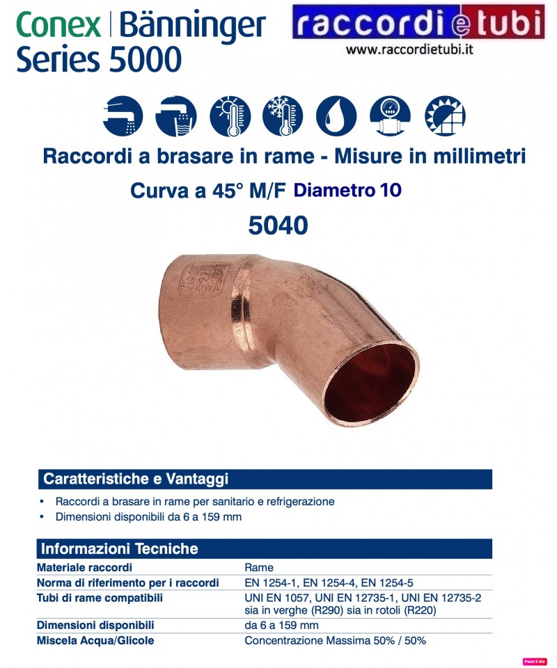 Die Fittings der Serie 5000 werden gemäß UNI EN 1254-1, UNI EN 1254-4 und UNI EN 1254-5 hergestellt und sind für die Herstellung von Verbindungen mit Kupferrohren geeignet, die nach UNI EN 1057, UNI EN 12735-1 und UNI EN 12735-2 produziert werden. Sie eignen sich für den Einsatz in Anlagen zur Zufuhr und Verteilung von kaltem und heißem Wasser, Heizung und Kühlung, brennbaren Gasen und Kältemitteln.