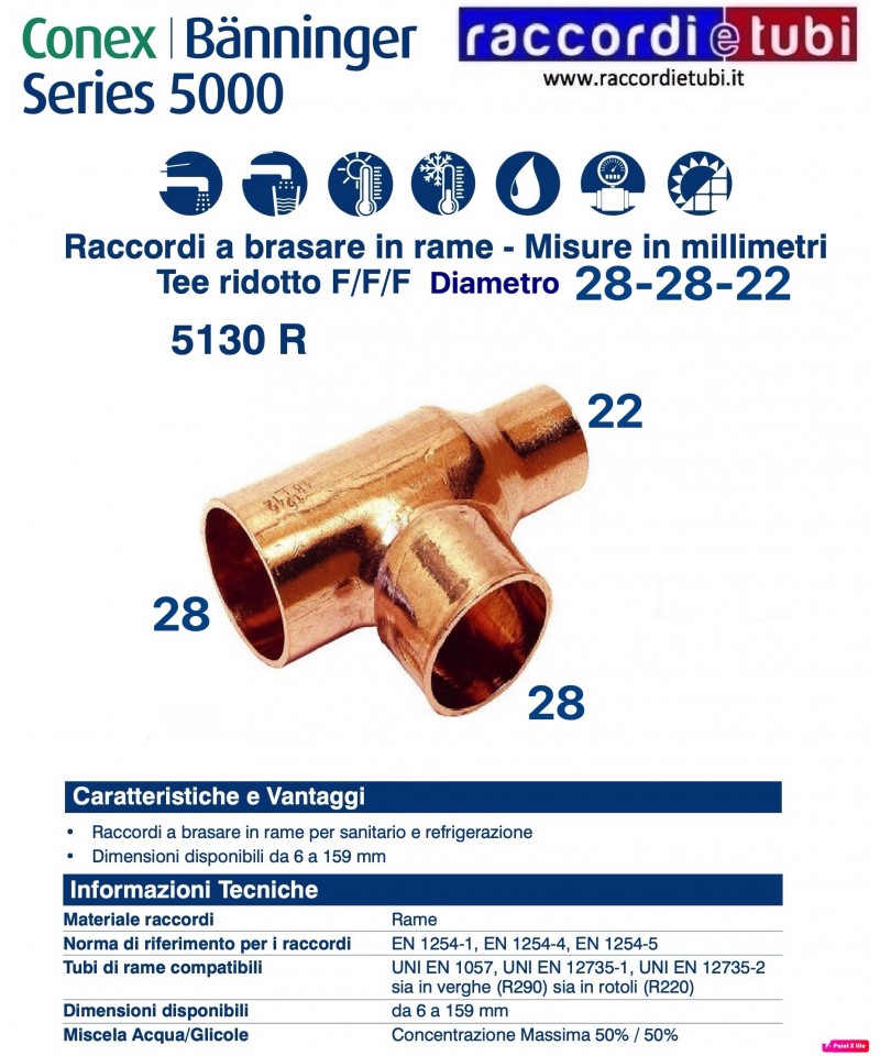 Die Fittings der Serie 5000 werden gemäß UNI EN 1254-1, UNI EN 1254-4 und UNI EN 1254-5 hergestellt und sind geeignet für Verbindungen mit Kupferrohren, die nach UNI EN 1057, UNI EN 12735-1 und UNI EN 12735-2 produziert werden. Sie eignen sich für den Einsatz in Systemen zur Zuführung und Verteilung von kaltem und warmem Wasser, Heizung und Kühlung, brennbaren Gasen und Kältemitteln.