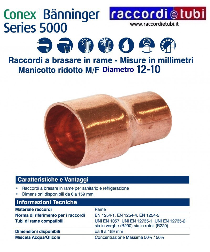 Die Verbindungsstücke der Serie 5000 werden gemäß UNI EN 1254-1, UNI EN 1254-4 und UNI EN 1254-5 hergestellt und sind geeignet für die Herstellung von Verbindungen mit Kupferrohren, die nach UNI EN 1057, UNI EN 12735-1 und UNI EN 12735-2 produziert wurden. Sie sind geeignet für den Einsatz in Systemen zur Zuführung und Verteilung von kaltem und heißem Wasser, Heizung und Kühlung, brennbaren Gasen und Kältemitteln.