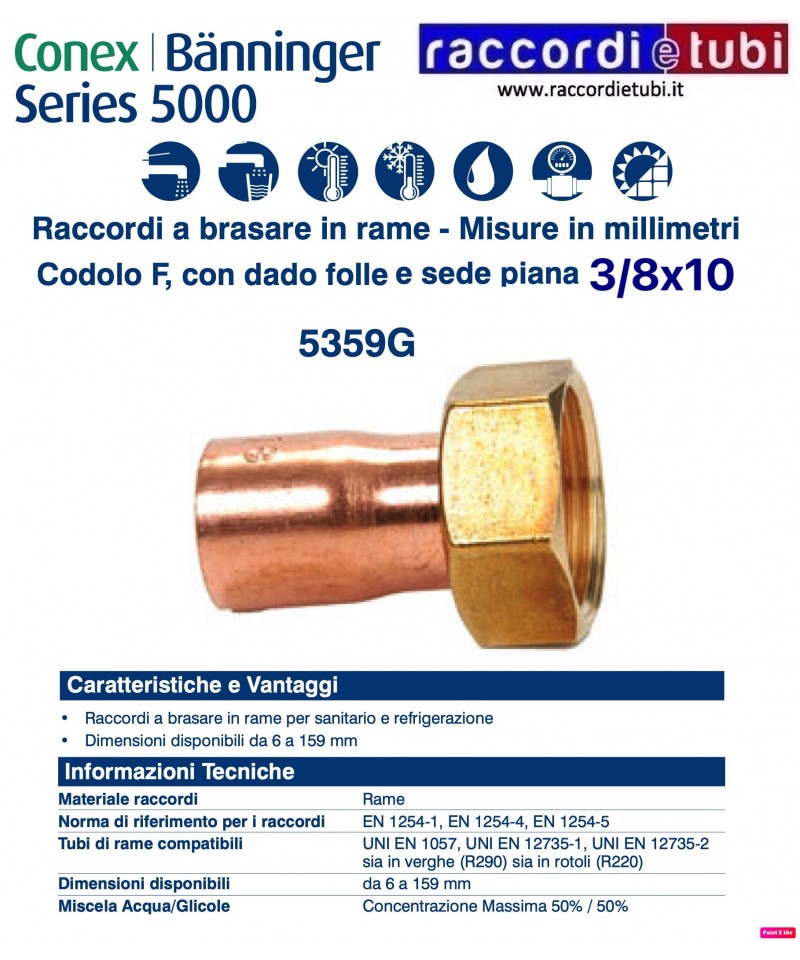 Die Verbindungen der Serie 5000 werden gemäß UNI EN 1254-1, UNI EN 1254-4 und UNI EN 1254-5 hergestellt und sind für die Herstellung von Verbindungen mit Kupferrohren geeignet, die gemäß UNI EN 1057, UNI EN 12735-1 und UNI EN 12735-2 produziert werden. Sie sind für den Einsatz in Kalt- und Warmwasserleitungen, Heiz- und Kühlanlagen, sowie für brennbare Gase und Kältemittel geeignet.