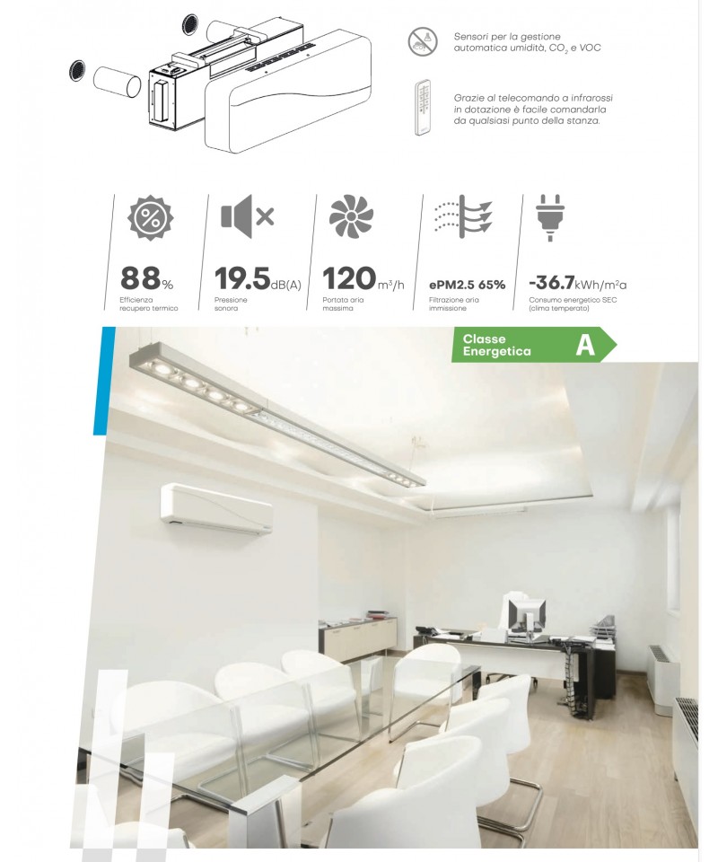 Hohe Effizienz: Der integrierte Abluftventilator in PICO PRO bietet eine hohe Effizienz, mit einer Entnahmekapazität von bis zu 90%. Dies wird durch einen Wärmeübertrager mit Wabenstruktur aus keramischem Material ermöglicht, der die thermische Effizienz maximiert.