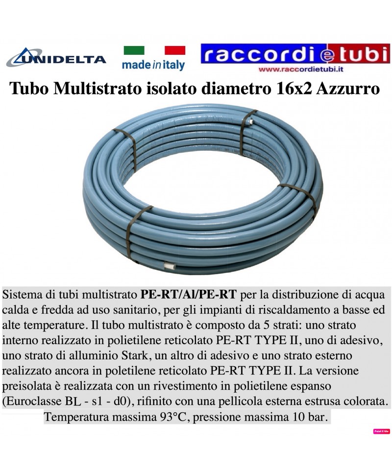 eine Innenschicht aus vernetztem Polyethylen PE-RT TYPE II, eine aus Klebstoff, eine Schicht aus Aluminium Stark, eine weitere aus Klebstoff und eine Außenschicht, die erneut aus vernetztem Polyethylen PE-RT TYPE II besteht.