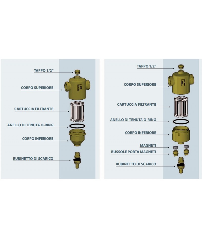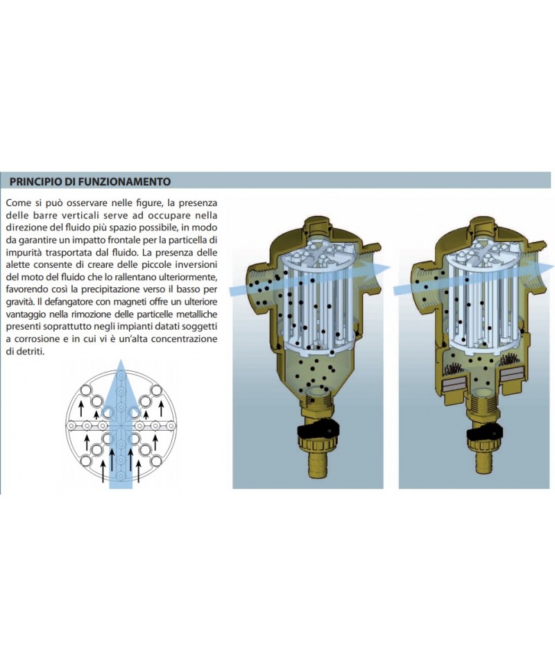 Defangator für Heizungsanlagen, ausgestattet mit Magneten zur Entfernung von Eisenpartikeln. • Gehäuse aus Messing CB753S • Anschluss an die Rohrleitungen: F-F • Anschluss im oberen Teil 1/2” mit Verschlussdeckel • Ablassventil zur Entleerung von Schlamm • Nenn Druck: 10 bar • Maximale Betriebstemperatur: 110°C • Herausnehmbare Magneten • Patentiert