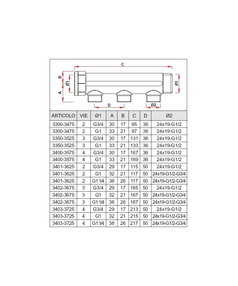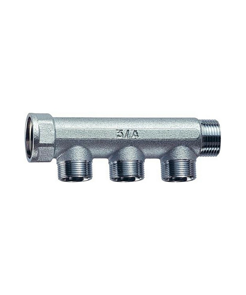 Modularer verchromter Verteiler • Körper aus Messing CB753S • Austauschbare Anschlüsse für Kupfer-, Kunststoff- und Mehrschichtrohre • Seitenanschlüsse: 3/4” - 1” männlich-weiblich • Abstand der Abzweigungen: 36 mm
