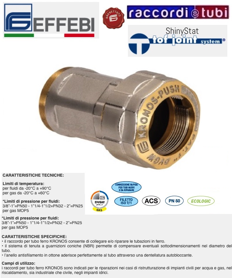 Verfügbar in weiblicher, männlicher und gleitender Rohr-Rohr-Version, in den Größen 3/8 und 2", ist die Verbindung konzipiert und vollständig in Italien von Effebi Spa hergestellt.