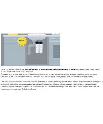 Der Schutz von Anlagen und Geräten vor den schädlichen Auswirkungen von hartem Wasser ist eine der drängendsten Anforderungen für private Nutzer, aber nicht nur für diese: OneFlow® Ge-Mini ist das neue kompakte und innovative System zur Kalkprävention, ohne den Einsatz von Salzen, Chemikalien oder Elektrizität.