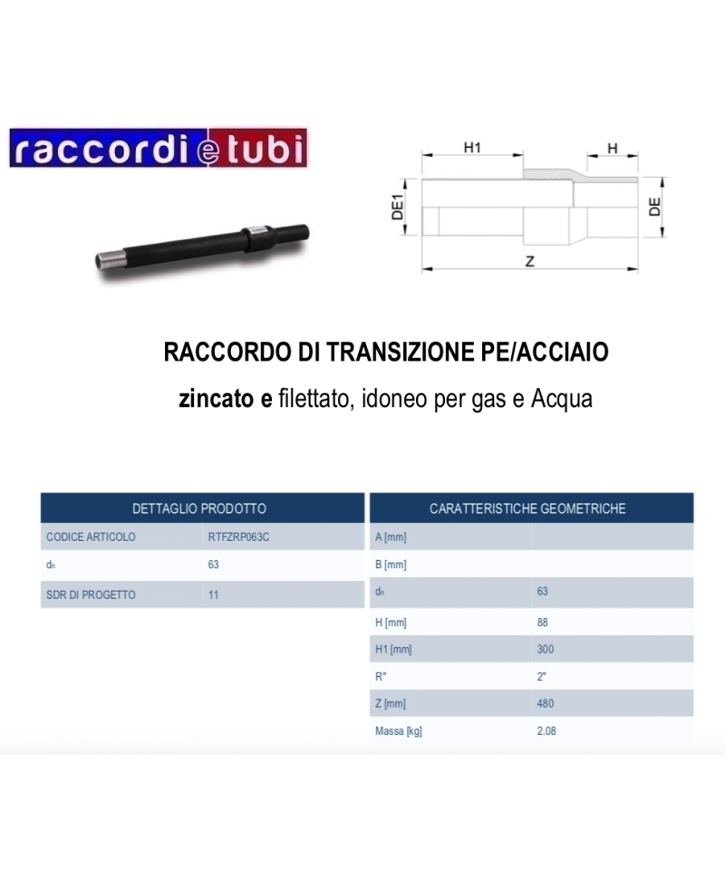 Der Übergangsverbinder Recht PE/STAHL, beschichtet mit Polyethylen und verzinkt (gewindegeeignet für Gas und Wasser), wird für Rohrleitungssysteme zur Verteilung von Wasser, Gas und für industrielle Anwendungen verwendet.