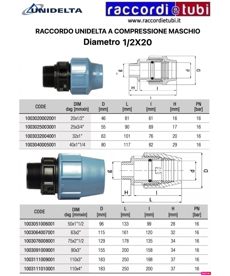 Die Einpressverbindung 1001, hergestellt aus PP-Polyethylen von Unidelta, dient dem Transport von Trinkwasser und Flüssigkeiten unter Druck bis zu 16 bar. Die Einpressverbindung 1001 aus PP von Unidelta gewährleistet eine perfekte hydraulische Dichtung bei der Ausführung von Druckverteilungsanlagen. Die Unidelta-Reihe ist mit allen Rohren aus LDPE, HDPE, PE40, PE80, PE100 kompatibel, die gemäß den Normen EN 12201, ISO 4427, ISO 14236, ISO 13460, DIN 8074 hergestellt sind. Die Einpressverbindung 1001 von Unidelta ist ein spezifisches Produkt zur Verbindung von Rohren aus PP-Polyethylen mit einem Außendurchmesser zwischen 16 und 110 Millimetern.
