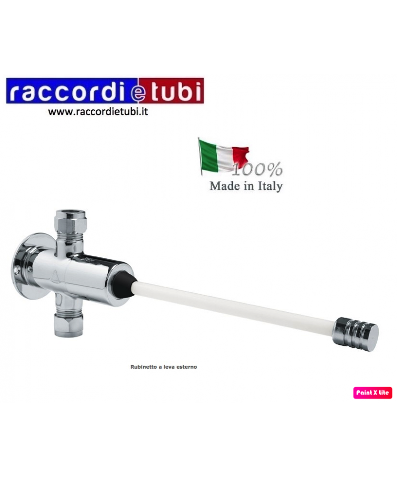 Professioneller Fußmischer – patentiert – durch Drücken erhält man kaltes, gemischtes und heißes Wasser – der Bedienhebel ist rot – wenn man den Fuß entfernt, läuft das Wasser weiterhin in der gewünschten Temperatur. Um das Wasser zu stoppen, drücken Sie den verchromten seitlichen Hebel – Eigenschaften wie im vorherigen Artikel.