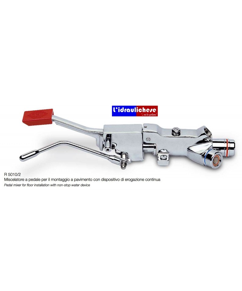 Professioneller Fußmischer – patentiert – durch Drücken erhält man kaltes, gemischtes und heißes Wasser – der Bedienhebel ist rot – wenn man den Fuß entfernt, läuft das Wasser weiterhin in der gewünschten Temperatur. Um das Wasser zu stoppen, drücken Sie den verchromten seitlichen Hebel – Eigenschaften wie im vorherigen Artikel.