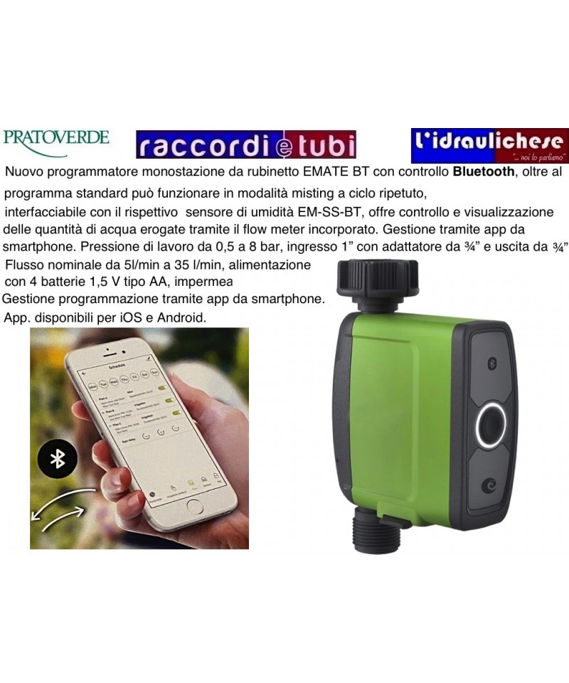 Programmable Monostation von SOLEM über Bluetooth. Kann sowohl für die Bewässerung als auch für die Nebelbewässerung verwendet werden. Im Bewässerungsmodus ermöglicht sie personalisierte wöchentliche Startzeiten, gerade Tage, ungerade Tage, alternierende Tage mit verzögertem Start, bis zu 8 tägliche Starts, bis zu 12 Stunden Öffnungszeit des Ventils. Im Nebelbewässerungsmodus ermöglicht sie personalisierte wöchentliche Startzeiten, bis zu 4 Zeitfenster, Pausen-/Arbeitszeiten in Sekunden, Minuten, Stunden, Tagen. Programmierung über SMART PHONE oder TABLET mit der MYSOLEM-App, die sowohl für ANDROID als auch für IOS verfügbar ist.