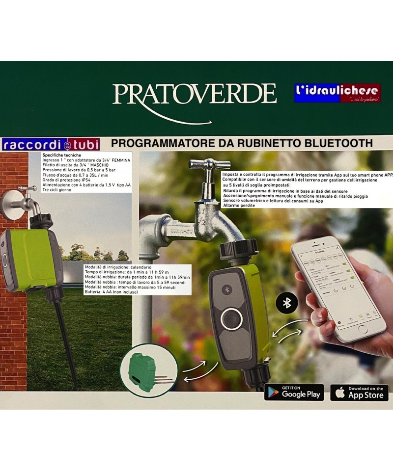 Sehr einfach zu bedienen: Durch Drücken der "grünen" Taste wird das Programm gestartet: Wenn die Bewässerung als ausreichend erachtet wird, drückt man die "rote" Taste. Praktisch speichert die Zeit zwischen den beiden Operationen und wiederholt das Programm, das maximal 60 Minuten dauert, jeden Tag zur selben Uhrzeit. Eine Leuchtdiode zeigt alle Phasen der Programmierung an und kann jederzeit die vom Benutzer festgelegten Zeiten anzeigen. Außerdem ist es möglich, die Bewässerungszeiten auch über einen sehr einfachen "Impuls-Code" festzulegen, wobei immer die beiden Tasten und mit Hilfe der Leuchtdiode verwendet werden. Mit waschbarem Filter ausgestattet. Mit einer 9-V-Alkalibatterie ausreichend für die gesamte Saison. Elektronik vollständig wasserdicht. Betriebsdruck von 0,1 bis 12 atm. 100% kontrolliert und getestet.