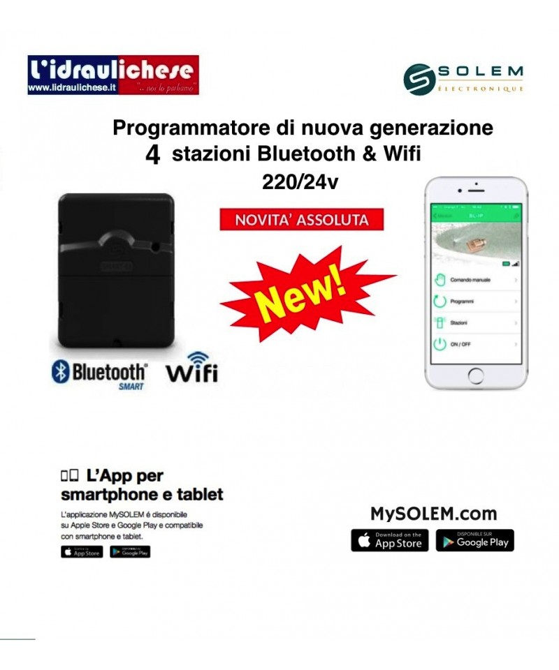 Programmable Monostation von SOLEM über Bluetooth. Kann sowohl für die Bewässerung als auch für die Nebelbewässerung verwendet werden. Im Bewässerungsmodus ermöglicht sie personalisierte wöchentliche Startzeiten, gerade Tage, ungerade Tage, alternierende Tage mit verzögertem Start, bis zu 8 tägliche Starts, bis zu 12 Stunden Öffnungszeit des Ventils. Im Nebelbewässerungsmodus ermöglicht sie personalisierte wöchentliche Startzeiten, bis zu 4 Zeitfenster, Pausen-/Arbeitszeiten in Sekunden, Minuten, Stunden, Tagen. Programmierung über SMART PHONE oder TABLET mit der MYSOLEM-App, die sowohl für ANDROID als auch für IOS verfügbar ist.