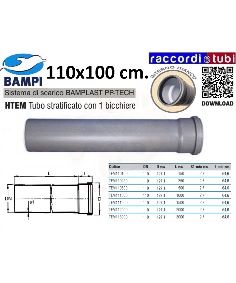 Gewicht von 1,071 kg für ein Rohr Ø 110 mm mit einem Glas von 1 Meter Länge.