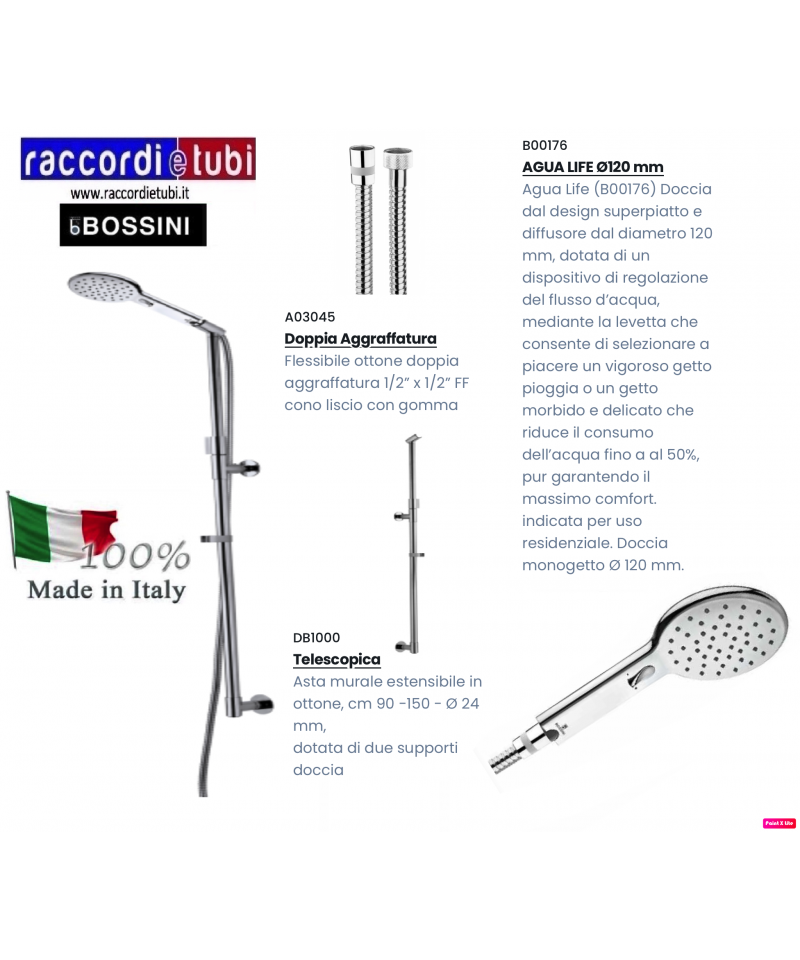 Set Teleskopstange Ø 24 mm aus Messing mit 2 Duschhaltern - Dusche AGUA-LIFE Ø 120 mm - Messingflexible mit doppelter Krimpung cm 175